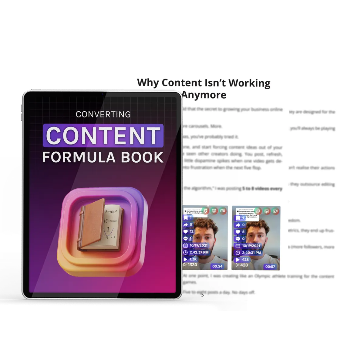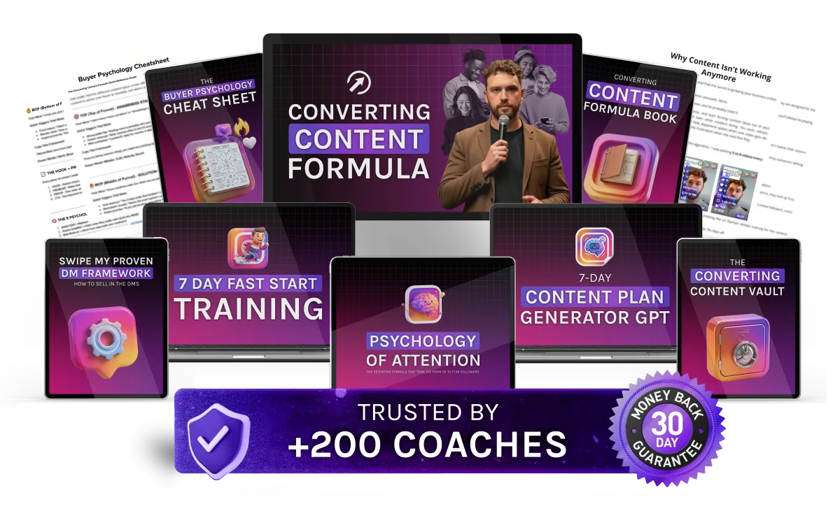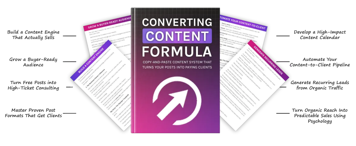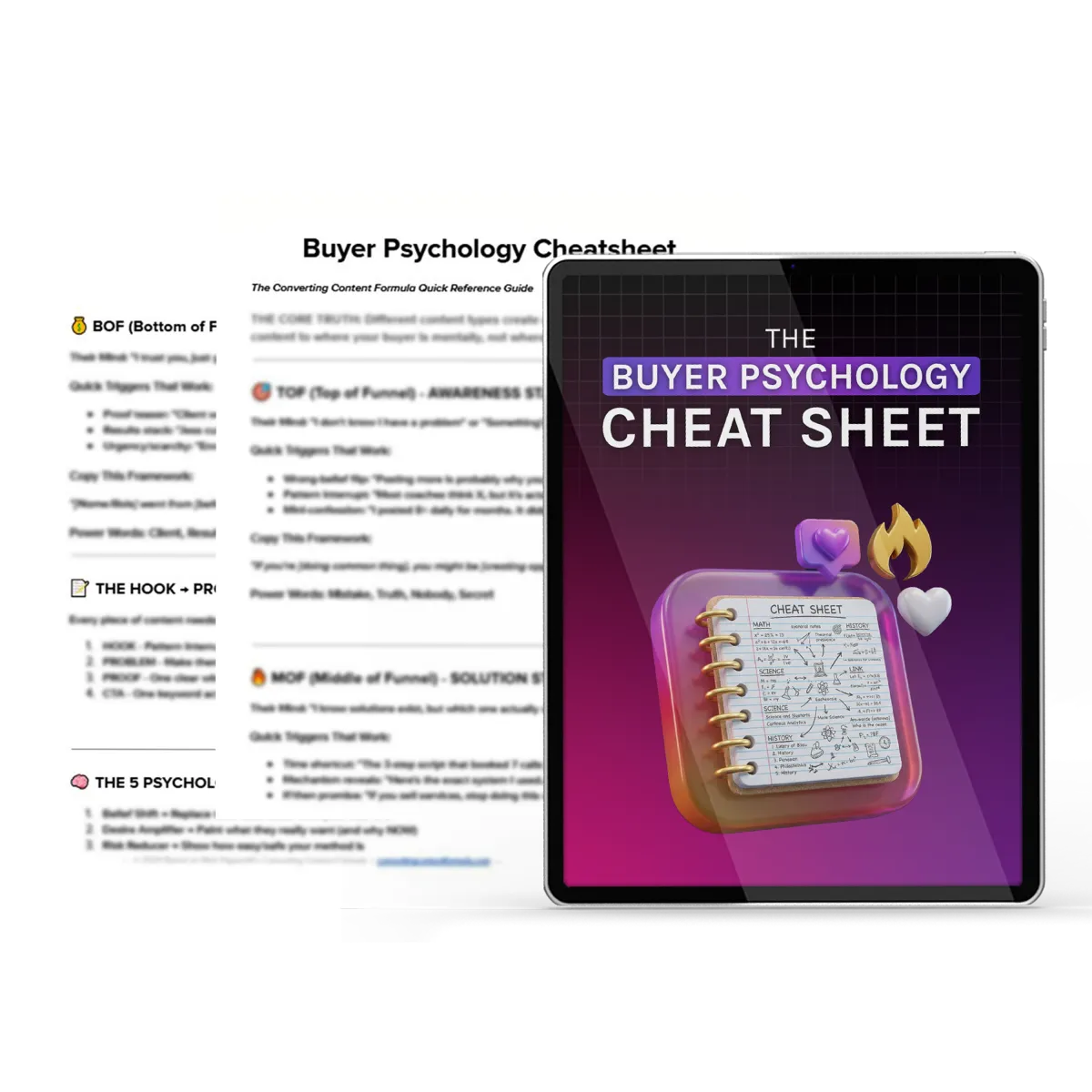A 71-page book plus video training that teaches you how to map your content to buyer psychology. You also get the 7-Day Content Plan Generator GPT, the Buyer Psychology Cheat Sheet, the Converting Content Vault (proven examples), and a DM Framework for closing conversations.
