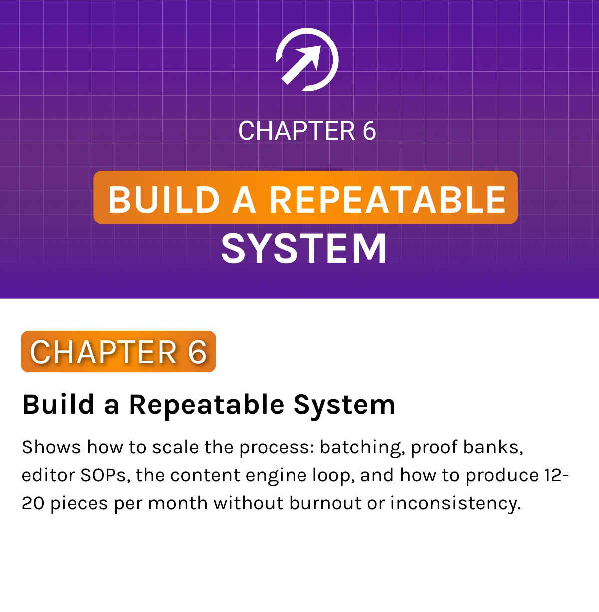 Consistency without burnout. Learn how to turn your content into a system using proof banks, batching, content containers, and simple SOPs so results compound instead of reset.