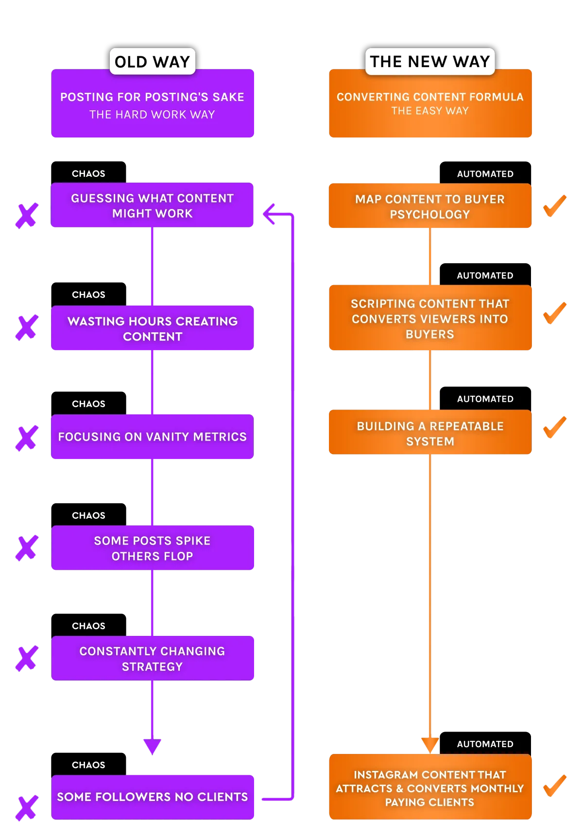 The old way requires guessing topics, rewriting scripts from scratch, micromanaging editors, copying trends, changing strategy weekly, and even buying ads to “force” reach.