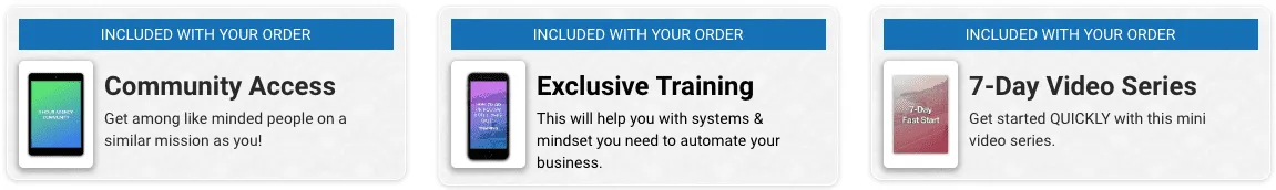 [INSERT ANSWER] You are getting a copy of the Automatic Clients ebook, available instantly. You are getting the highly praised 6+ hour Advanced Acquisition Theory course. You are getting our advanced Economics Calculator. You are getting our 2,854 Profitable Niches spreadsheet. You’re getting the 7-Day Fast Start video series, our best $200,000 Advertisement, access to our FB community, our 7-Figure Video Sales Letter script, and a 26-step Launch Checklist.